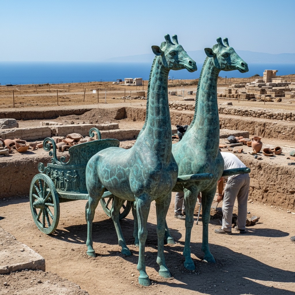 On the island of Samos, Greece, archaeologists unearthed a bronze statue depicting a chariot drawn by horses with elongated necks and faces resembling those of giraffes. This strange yet captivating depiction raises questions about the cultural exchanges and mythical imagery of the ancient Greeks. Could these “giraffe-like” horses suggest an artistic interpretation influenced by foreign trade, or were they symbolic creatures within Greek mythology? The discovery of the statue offers a unique insight into the imagination of a long-forgotten world.