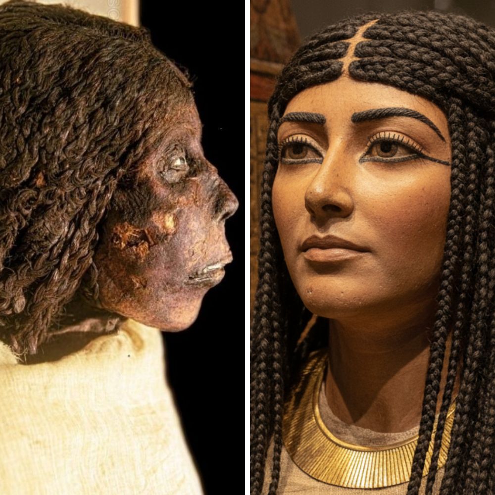 Artificial eyes made from stone and carefully crafted eyebrows of human hair enhanced her lifelike appearance. Embalmers used sawdust and resin to restore the body’s natural proportions and applied subtle facial coloring to achieve an idealized image. These meticulous efforts highlight the Egyptians’ belief in the necessity of presenting the deceased in their prime for the afterlife.
