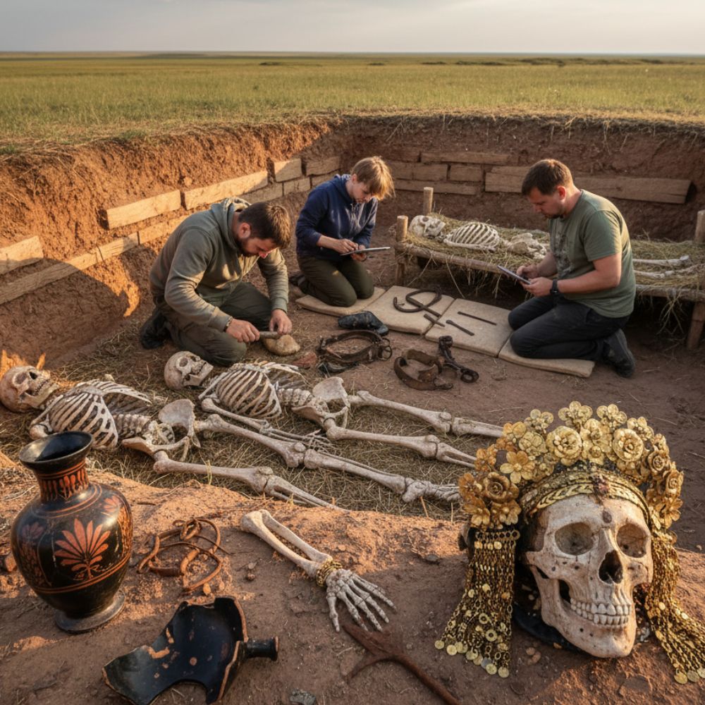 In a groundbreaking discovery, researchers from Russia’s RAS Insтιтute of Archeology have uncovered the remains of four Amazons, the legendary female warriors of ancient times, within a single tomb. This remarkable find not only sheds new light on the lives and customs of these formidable women but also provides a rare glimpse into the history of the Scythian nomadic tribes that once roamed the vast expanses of Eastern Europe.