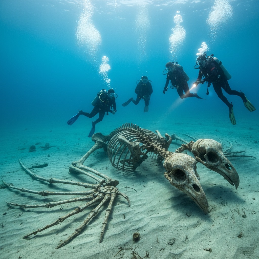 Spread across nearly thirty meters of seabed was the unmistakable shape of a colossal, bird-like skeleton — wings outstretched as though frozen mid-flight for eternity. The divers, equipped with state-of-the-art rebreathers and specialized lighting rigs, recorded the eerie sight in meticulous detail. The bones were astonishingly well-preserved, protected for millennia by the trench’s cold, anoxic waters.
