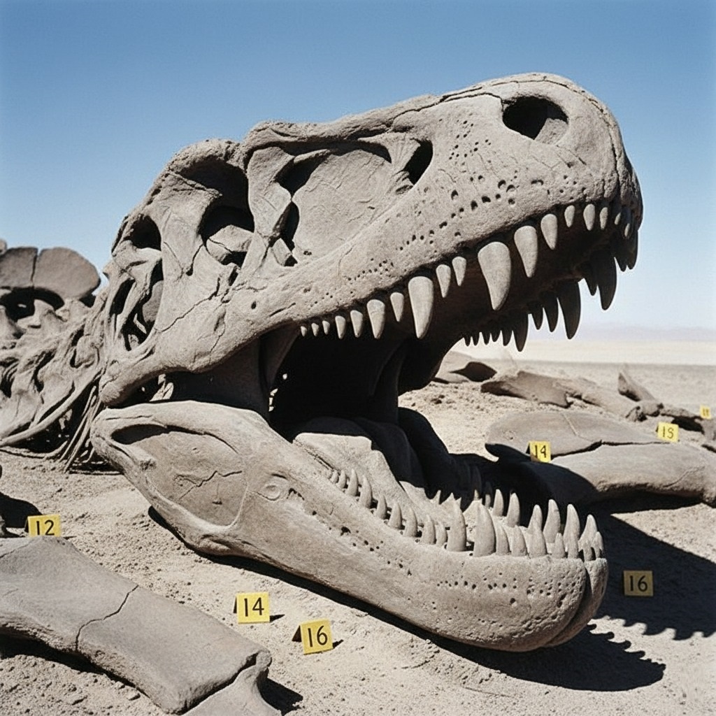 The bone was a rich, earthy brown, intricately textured with the wear of ages – a roadmap of cracks and crevices telling stories only the wind and sand had witnessed for millions of years. Its eye sockets, vast and hollow, seemed to gaze back with an ancient, predatory intelligence. The jaw, wide open, unveiled a terrifying arsenal: an array of pointed teeth, some conical and dagger-like at the front, others smaller and serrated along the sides, perfectly designed for tearing flesh.