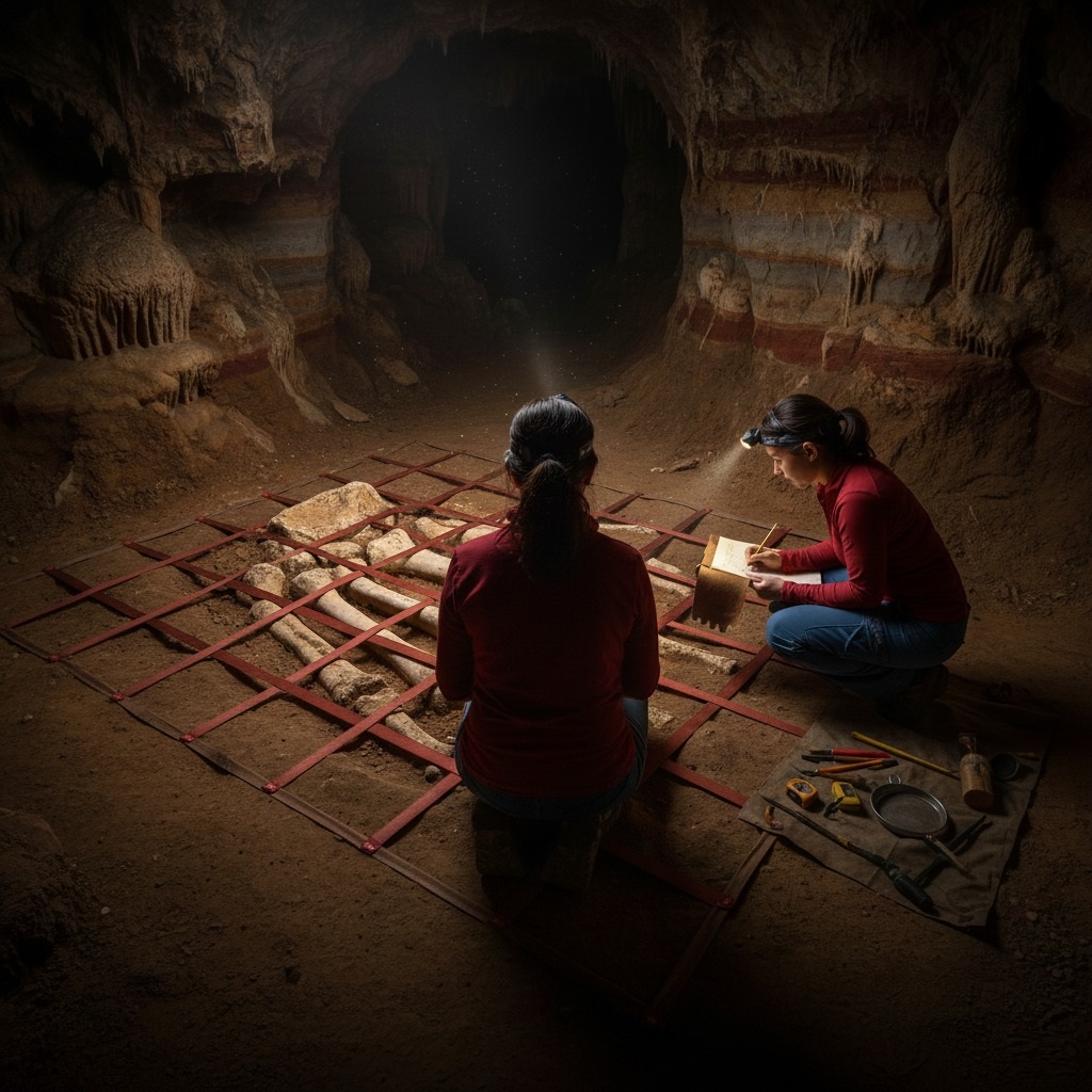 Aris, her dark hair pulled back, a smudge of dirt on her cheek, scribbled furiously in her waterproof notebook. Her red top and sturdy blue pants were practical, but her mind was anything but. This wasn’t merely a discovery; it was a re-writing of prehistory. Alongside her, other tools lay scattered: brushes, calipers, a small sieve for sifting through the earth. Every grain of soil was precious, every measurement critical. The flickering glow of her headlamp, the only source of focused light in the cavern’s vastness, seemed to dance with the magnitude of the find.