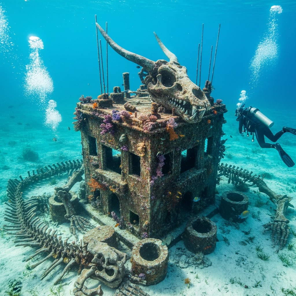 They deployed two divers, Dr. Ben Carter and Maya Singh, both seasoned in underwater excavation. As Ben and Maya glided closer, their flashlights danced over intricate carvings now blurred by time and marine life. What had initially seemed like decorative elements on the monument’s summit resolved into chilling detail: scattered bones, and most strikingly, the enormous, horned skull of an unknown beast, its vacant eye sockets staring out into the eternal blue. Beside it, a sinuous, segmented skeleton, undoubtedly from the same mythical creature, snaked around the monument’s base, its ribcage forming eerie archways.