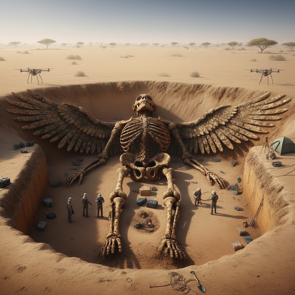 What they uncovered defied every known classification: the perfectly articulated skeleton of a winged humanoid, spanning nearly fifty meters from head to outstretched wingtip. Its bone structure suggested immense age, heavily fossilized and stained a deep ochre by the iron-rich desert soil. The skull, though distinctly humanoid, possessed an elongated cranium and delicate facial features, staring skyward from its ancient grave. The wings, meticulously preserved, were a marvel of avian-mammalian fusion, each feather shaft as thick as a man’s arm.