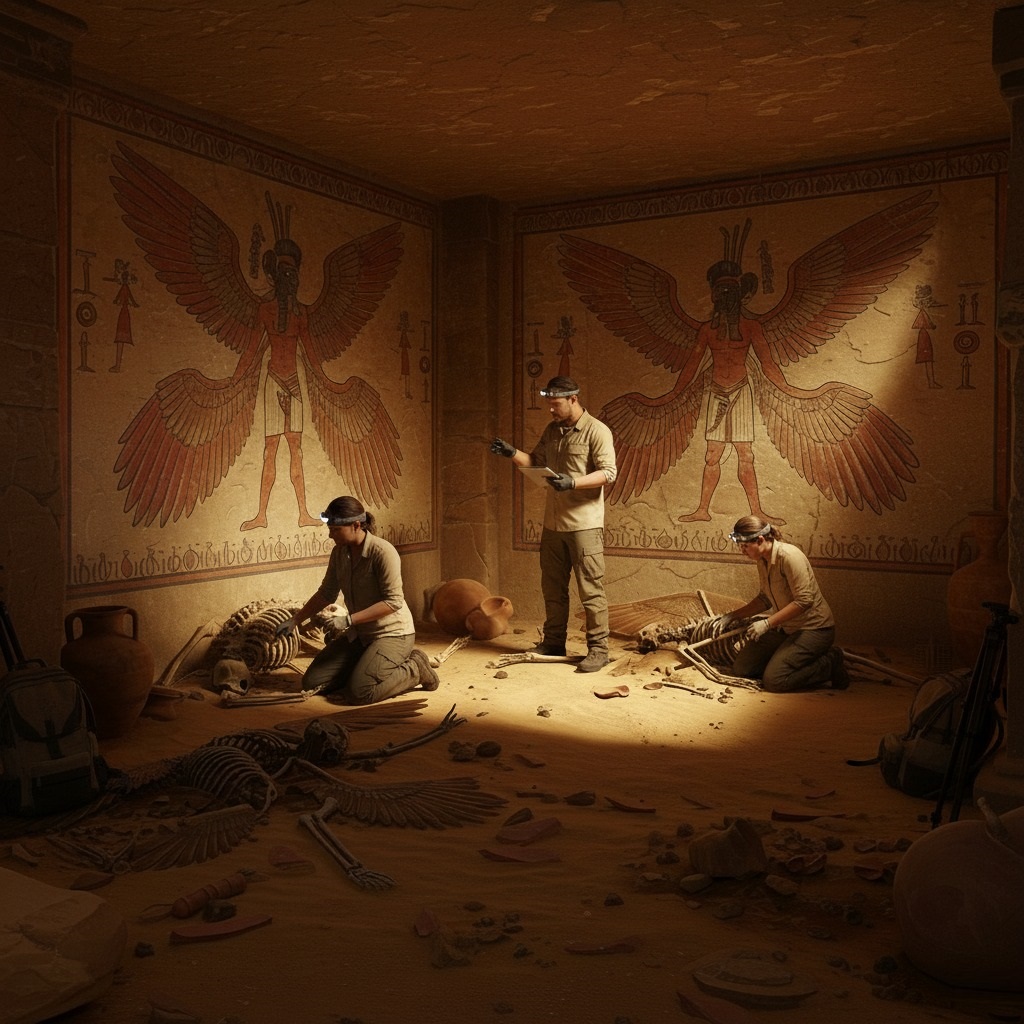 Evelyn’s mind raced. The undisturbed layers of sand, the lack of traditional burial, the winged guardians not seen elsewhere – this wasn’t just a tomb. It was a snapshot, a frozen moment in time, speaking of a tragedy, a desperate attempt to protect something, or perhaps, a warning. The skeletons weren’t mere ancient remains; they were characters in a millennia-old drama, waiting to tell their story.