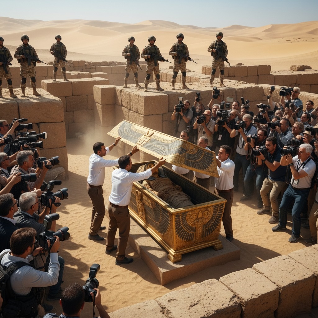 The golden sarcophagus lay at the heart of the pit, shimmering under the fierce midday sun like a beacon from another age. Its surface was adorned with intricate hieroglyphs and the majestic wings of Horus, untouched for millennia. For weeks, the team had worked tirelessly, carefully mapping the burial chamber, a previously unknown annex to a 5th Dynasty tomb. The preliminary findings suggested a high-ranking noble, perhaps even a forgotten royal.