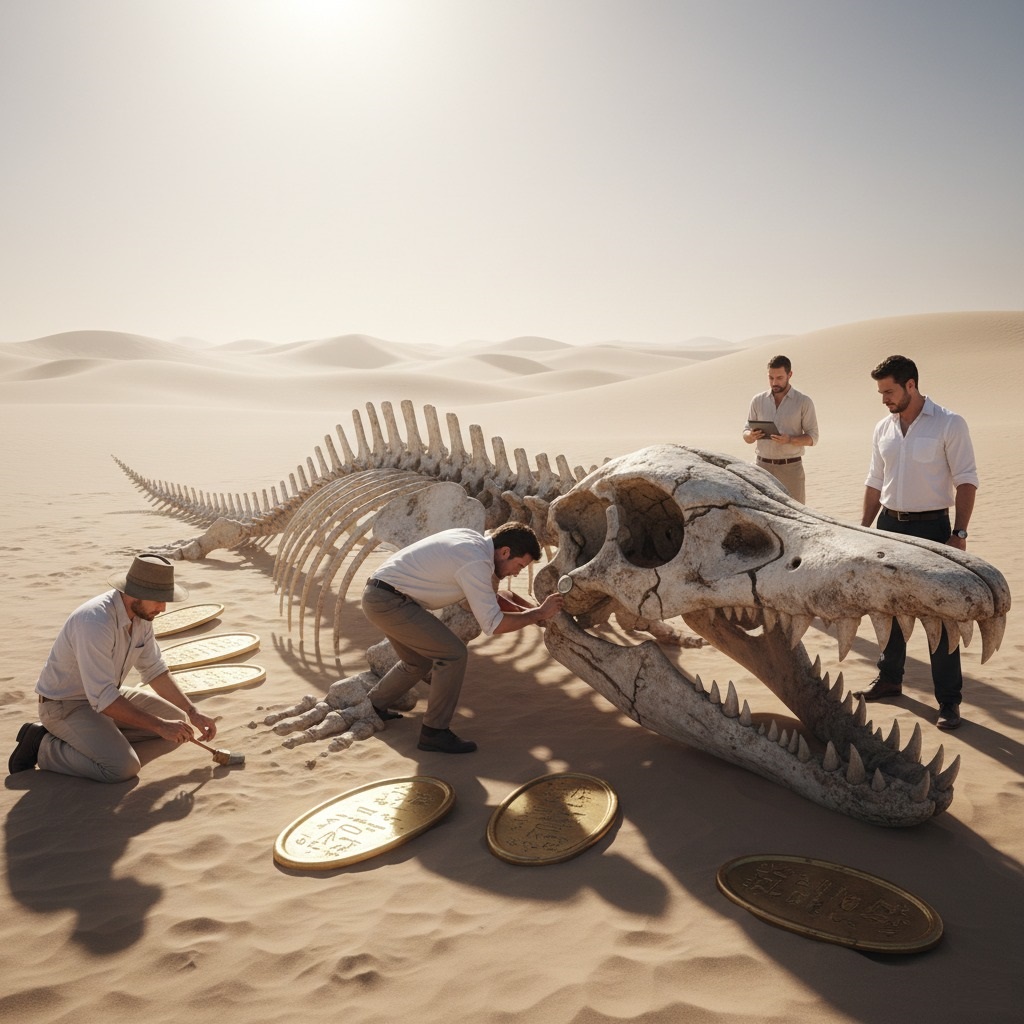 The scene now was one of hushed reverence. The four archaeologists from the initial description, including a now-older Alistair Finch, stood over the partially excavated skeleton. The golden tablets glinted under the harsh desert sun, their secrets still largely locked away. Alistair, now more of an elder statesman than a dig foreman, watched Anya as she pointed excitedly at a newly exposed tablet. Its intricate carvings seemed to pulsate with the weight of forgotten time.