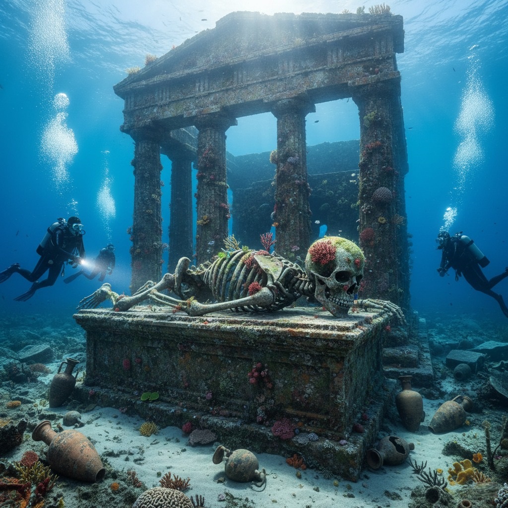 But it was what lay at the heart of this submerged sanctuary that truly seized Aris’s breath. On a massive stone altar, perhaps once a sacrificial platform or a funerary sarcophagus, rested a human skeleton. Time and marine life had etched their signatures onto the bones, transforming them into a macabre, yet beautiful, work of art. The skull, surprisingly intact, seemed to gaze out into the abyss, a silent sentinel of a forgotten age.