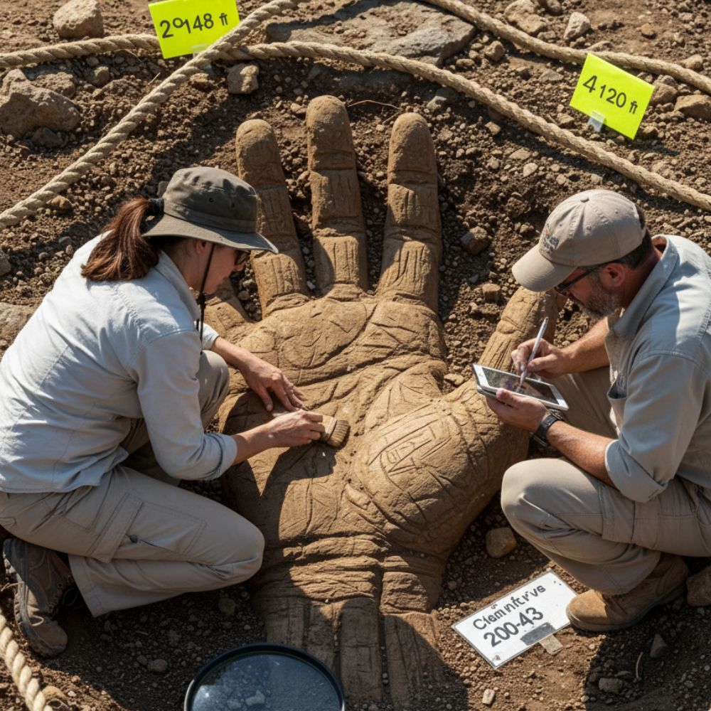 “It’s… it’s a hand,” whispered intern Elara Vance, her voice barely audible above the desert wind. Indeed, emerging from the ochre earth was a colossal, intricately carved hand, each finger thicker than a man’s torso, its palm etched with what appeared to be ancient, geometric patterns. It was as if a titan had merely rested its hand upon the earth eons ago, and now, it was slowly rising to greet the modern world.