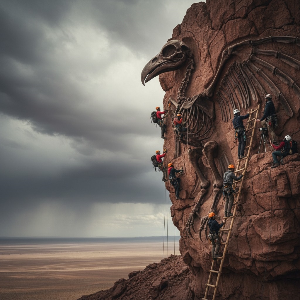 The challenges of excavation were immense. The fossil was embedded high on a sheer cliff face, accessible only by ropes and specialized climbing gear. Under a sky that often brooded with dark, dramatic clouds, threatening the rare but ferocious desert storms, the team began their painstaking work. Rock climbers, meticulously trained in delicate archaeological techniques, rappelled down the cliff, carefully brushing away millennia of accumulated dust and rock, revealing more of the bone structure with each passing day.