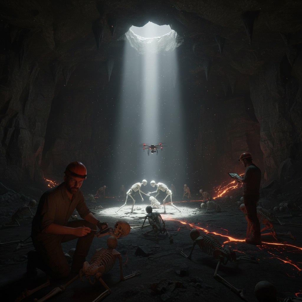 What the light revealed was a sight that would haunt their dreams: a macabre ballroom of skeletons. Hundreds of human remains, stark white against the dark, obsidian-like rock, lay scattered across the floor. Molten fissures glowed a sinister orange, veins of liquid fire snaking through the earth, giving the impression that the very ground was alive and breathing hellfire.