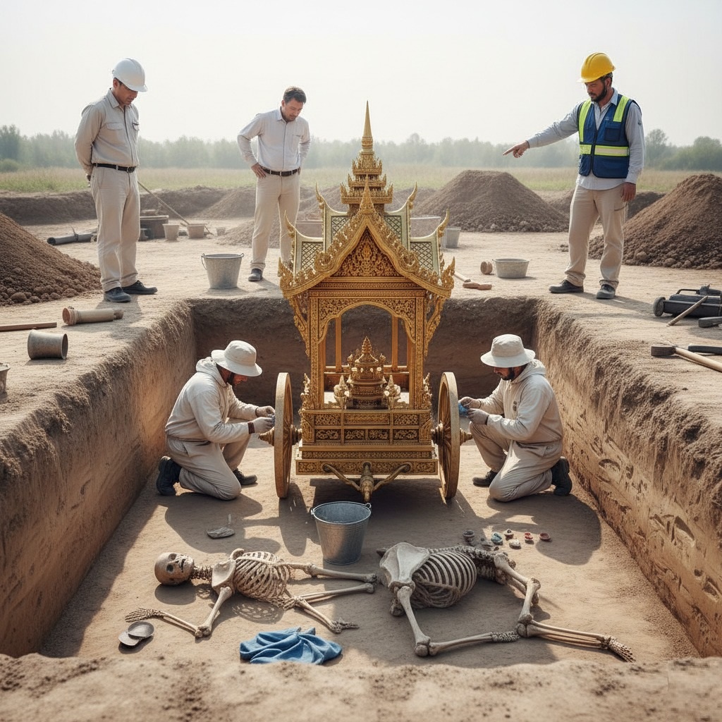 But it was the object nestled between the skeletons that stole his breath. Dominating the trench floor, a magnificent golden chariot, or perhaps a funerary shrine, gleamed dully in the filtered light. Its surface was alive with intricate carvings – celestial dancers, mythical creatures, and delicate floral motifs that spoke of an artistry lost to the ages. A tiered roof crowned its structure, and large, solid golden wheels hinted at its original grandeur. It was unlike anything found in Buddhist archaeological contexts in India before.
