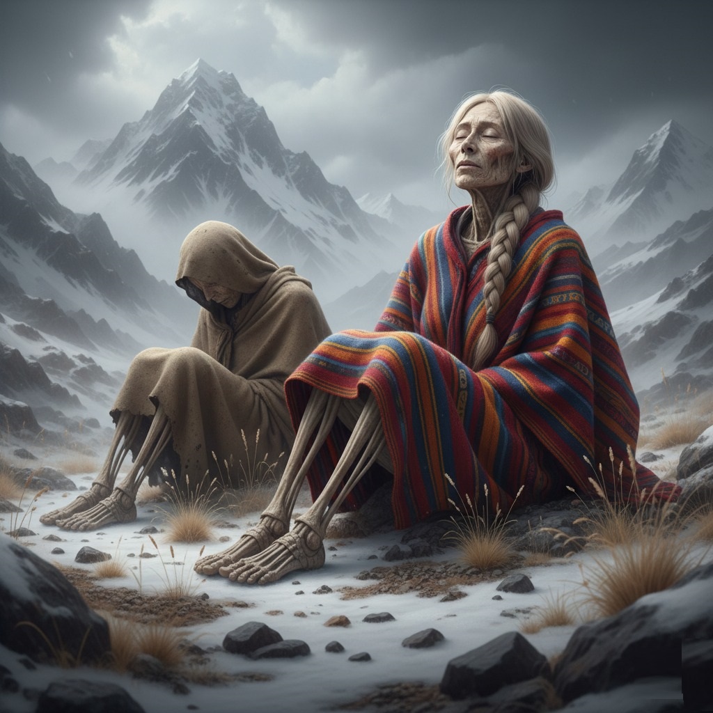 They were seated upright, perfectly preserved by the relentless cold and dry air, mummified not by elaborate embalming but by nature’s unyielding embrace. The first, more prominent figure, immediately commanded attention. It was a woman, her face a serene, desiccated mask, eyes closed as if in eternal slumber. Her long, pale hair, braided meticulously, lay over her shoulder, bleached by centuries of sun and frost. She was clad in a beautifully woven textile—a poncho of vibrant reds, oranges, yellows, and deep blues—its patterns still astonishingly clear despite the passage of untold seasons. Her skeletal feet, remarkably intact, rested on the frozen earth.