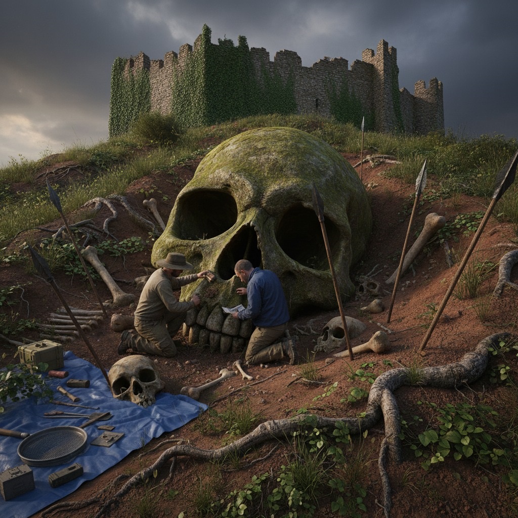 Now, in the present day, with LIDAR technology revealing anomalies beneath the earth and satellite imagery pinpointing unusual ground disturbances, Dr. Thorne’s team had returned. He ran his gloved hand over the moss-dappled bone, noting the incredible preservation. Beside him, his lead palaeontologist, Dr. Lena Petrova, meticulously brushed away soil from a lower jawbone, her expression a mix of awe and disbelief. Scattered around them were fragments of smaller, recognizably human skulls, and primitive iron-tipped spears—evidence of a conflict of unthinkable proportions. The backdrop was the haunting, ivy-covered ruins of what looked like a much older, pre-Roman fortification, perched atop the very hill the giant skull rested against, its stones whispering of forgotten ages.