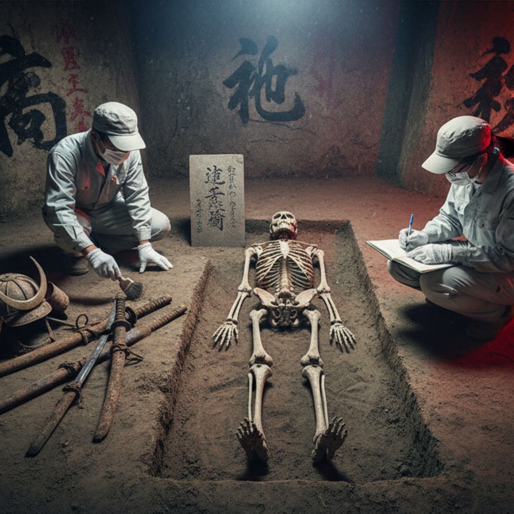 “Lighting check, Kenji,” Arata murmured, his voice hushed in the cavernous space. Kenji, his most promising protégé, adjusted the portable LED lamp, bathing the central figure in a stark, revealing glow. The bones, bleached by centuries, lay supine, a silent testament to a life lived long ago. To the skeleton’s left, a treasure trove had revealed itself: a rusted kabuto, a samurai helmet, its lacquered surface long since degraded but its form unmistakable. Beside it, two tachi—early forms of the katana—still sheathed, their iron hilts corroded but their deadly purpose evident. Other smaller, unidentifiable metal fragments lay scattered, whispering tales of forgotten craftsmanship.