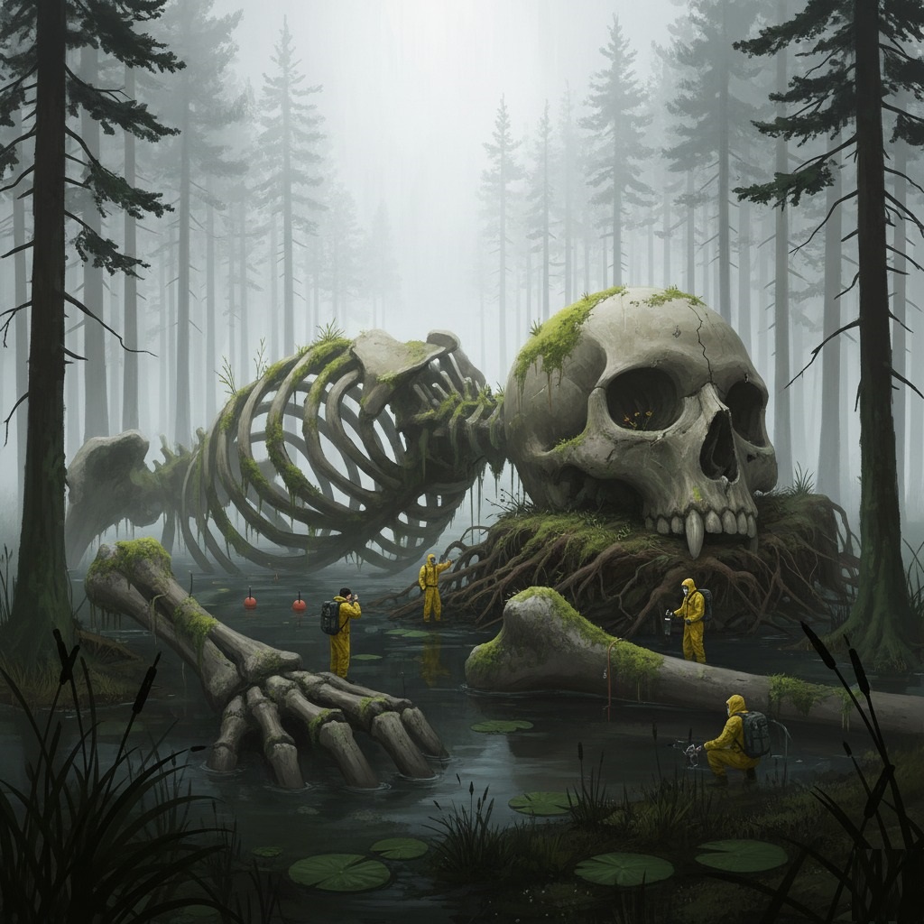 “My God,” whispered Dr. Lena Petrova, the team’s lead geologist, her breath catching in the cold, damp air. Before them lay the gargantuan skeleton of what could only be described as a humanoid giant. Its skull alone was the size of a small house, weathered and green with ancient moss, half-buried in a mound of earth and roots. The immense rib cage, like the hull of a long-sunk ship, broke the surface of the murky swamp, its bone-plates encrusted with lichen and the detritus of forgotten epochs.