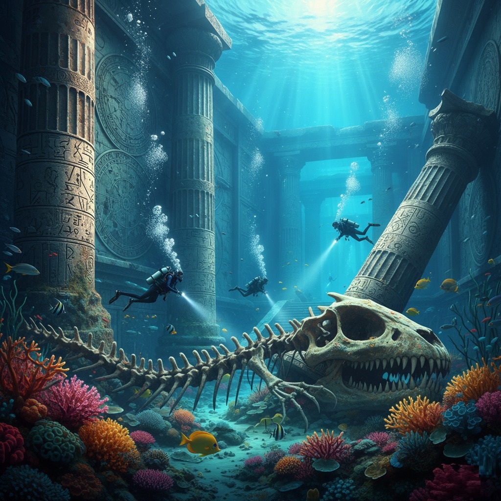 Suddenly, a vast shadow materialized, eclipsing the coral gardens. It wasn’t stone. It was bone. Mammoth vertebrae, each segment larger than a man, stretched for dozens of feet across the temple’s ancient paving. At the end lay the skull – a grotesque, magnificent edifice of bone, horned and fanged, its empty eye sockets staring into the perpetual twilight. It was the skeleton of a creature of impossible scale, something out of the darkest myths.