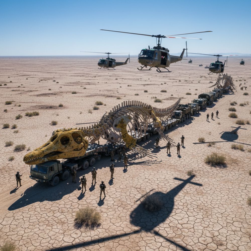 Above, a formation of Bell UH-1 Iroquois helicopters, their rotors beating a rhythmic thrum against the vast silence of the desert, provided aerial escort and observation. Their dark, distorted shadows raced across the dry terrain, mirroring the ground team’s movements. Military personnel, clad in tactical gear, moved with a quiet efficiency, their presence a stark reminder of the mission’s sensitive nature. They were not just soldiers; they were guardians of an unparalleled discovery, ensuring its safe passage to a secure, undisclosed facility for study.