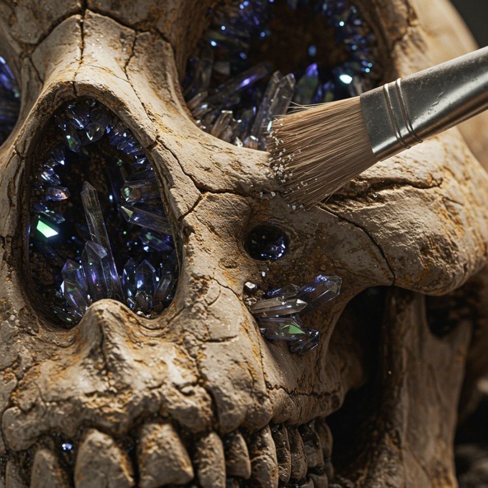 But it was what filled the eye sockets that truly defied explanation. Shimmering, multifaceted crystals of deep sapphire and regal amethyst sparkled from within the vacant gaze, casting ethereal glints in the dim light of the tomb. Smaller fragments of these same gems were embedded directly into the “bone” itself, as if the very rock had crystallized around them over countless centuries.
