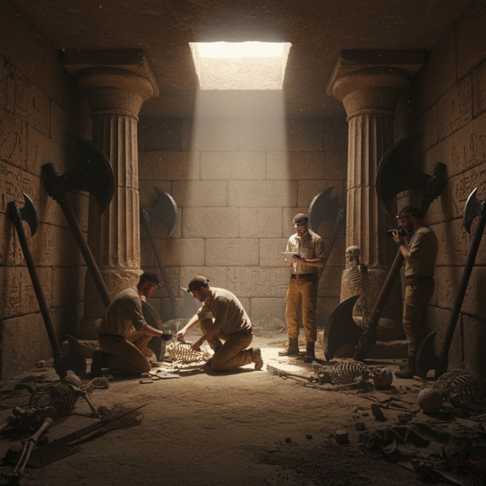 Propped against the walls and pillars were not sarcophagi, but colossal, wicked-looking battle-axes. Their dark, crescent-shaped blades gleamed faintly, their wooden shafts thick with the patina of ages. These weren’t ceremonial tools; they were instruments of war. And beneath them, scattered across the dusty floor, lay dozens of human skeletons, some perfectly preserved, others fragmented by time and settling earth.