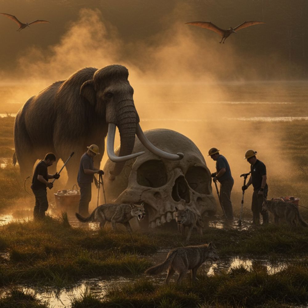 As they toiled, the world around them seemed to ripple with echoes of its distant past. A shaggy woolly mammoth, its tusks spiraling like ancient ivory, ambled into view, drawn perhaps by the disturbance, or merely navigating its ancient migratory path through the mists. A pack of dire wolves, eyes glinting with primeval intelligence, padded silently through the shallow pools, their keen senses alert to the scent of freshly disturbed earth. High above, three massive pterosaurs, creatures long thought confined to earlier epochs, circled in silent majesty, their leathery wings catching the burgeoning light.