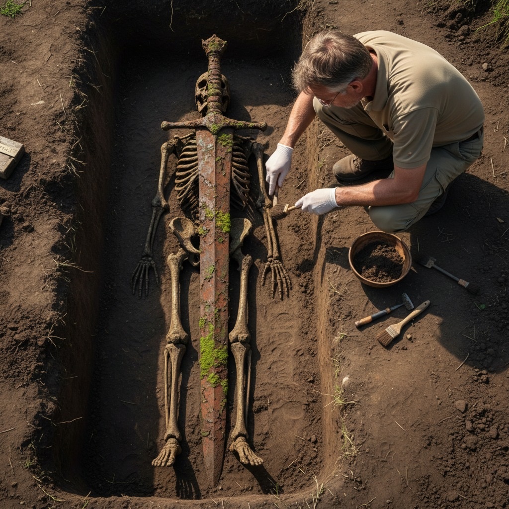 The skeleton itself was a marvel. Over seven feet tall, robust and clearly male, every bone spoke of immense strength. The sword lay perfectly aligned with him, as if it had been his constant companion in life and beyond. It was unlike anything ever found in British soil, hinting at a warrior tradition far more sophisticated, or perhaps even an individual of legendary status, previously unknown.