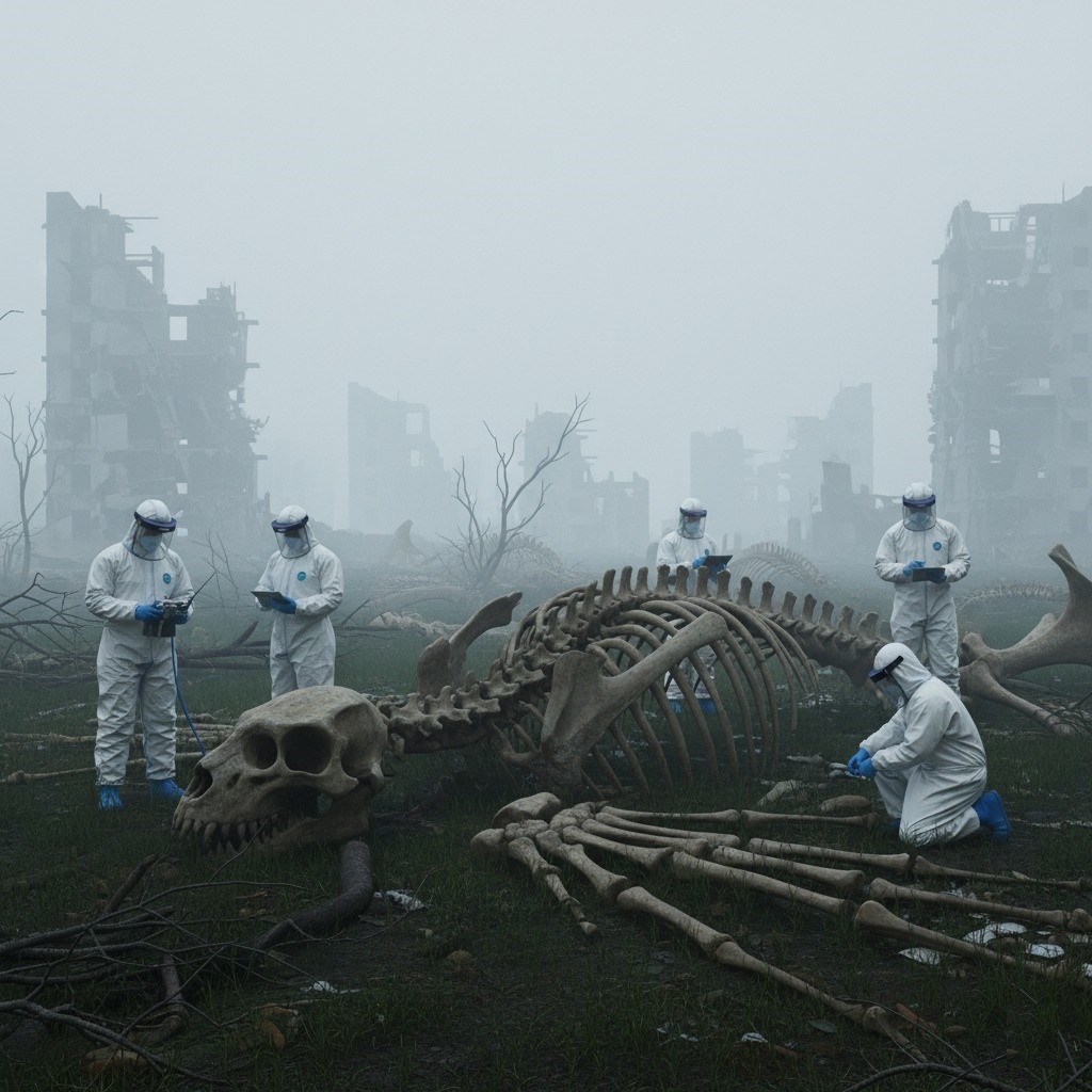 Dr. Aris Thorne, head of the Neo-Paleontology Division, wiped condensation from his visor. “Readings are still off the charts, Team. Nothing in the pre-Collapse databases matches this bone density.” Around him, his four-person team, clad in stark white environmental suits against the perpetual mist, moved with practiced precision. The air, despite centuries, still held a faint, metallic tang, a whisper of the disaster that had reshaped this land.
