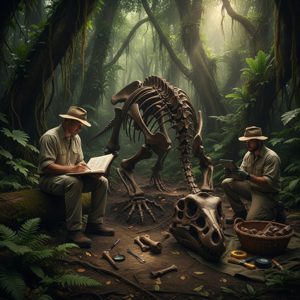 The original discovery was now a colossal, near-complete skeleton of a previously unknown species of long-necked sauropod, which they’d tentatively named Borneosaurus maximus. It was an astonishing find, rewriting chapters of Gondwanan paleogeography. The image captured that very morning showed Aris, perched on a moss-covered fallen log, sketching fine details into his notebook, comparing the bone structure to projections on his iPad. Lena, kneeling opposite him, carefully photographed the massive skull, using her tablet to record precise GPS coordinates and geological strata data.