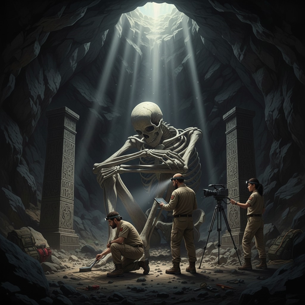 Before them, hunched in a posture of eternal contemplation, sat a skeleton of unimaginable proportions. It was colossal, easily thirty feet tall, its bone-like structure seamlessly integrated with the rough-hewn rock of the cave. The sheer scale was breathtaking, dwarfing the team, making them feel like ants before an ancient titan. On either side, two massive stone pillars, intricately carved with symbols that vaguely resembled the Nazca Lines but with a chillingly alien complexity, stood like silent sentinels.