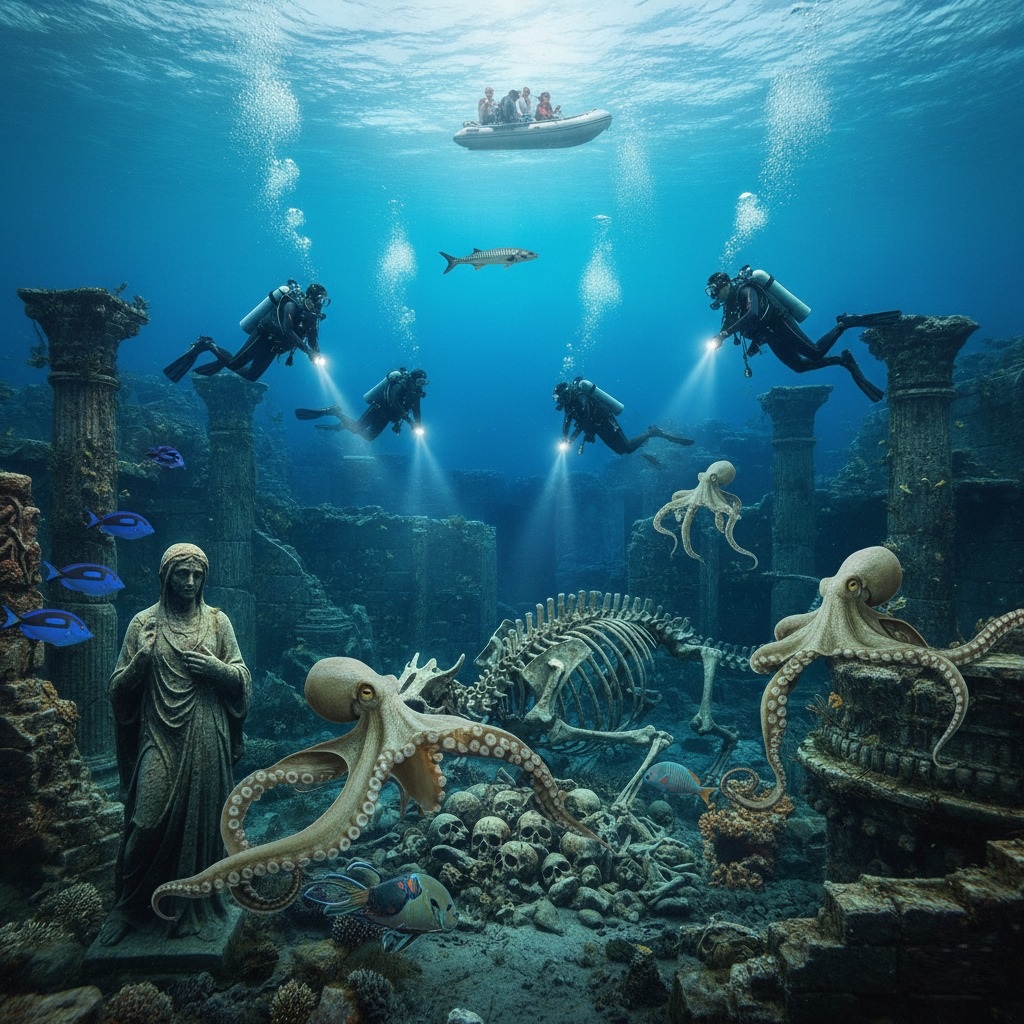 The divers, their powerful lights cutting through the murky depths, were met with an astonishing and eerie sight. Piled among the fallen blocks and within crumbling alcoves lay a graveyard unlike any known to history. Thousands of human skulls, bleached white and encrusted with marine growth, formed mounds that seemed to stretch into the gloom. But it was the centerpiece that truly defied belief. Resting majestically amidst the human remains was the gargantuan skeleton of a creature unknown to science – a leviathan with massive ribs, a serpentine spine, and a skull crowned with horn-like protrusions. Its sheer scale dwarfed the divers, who moved like ants around its ancient, silent form.