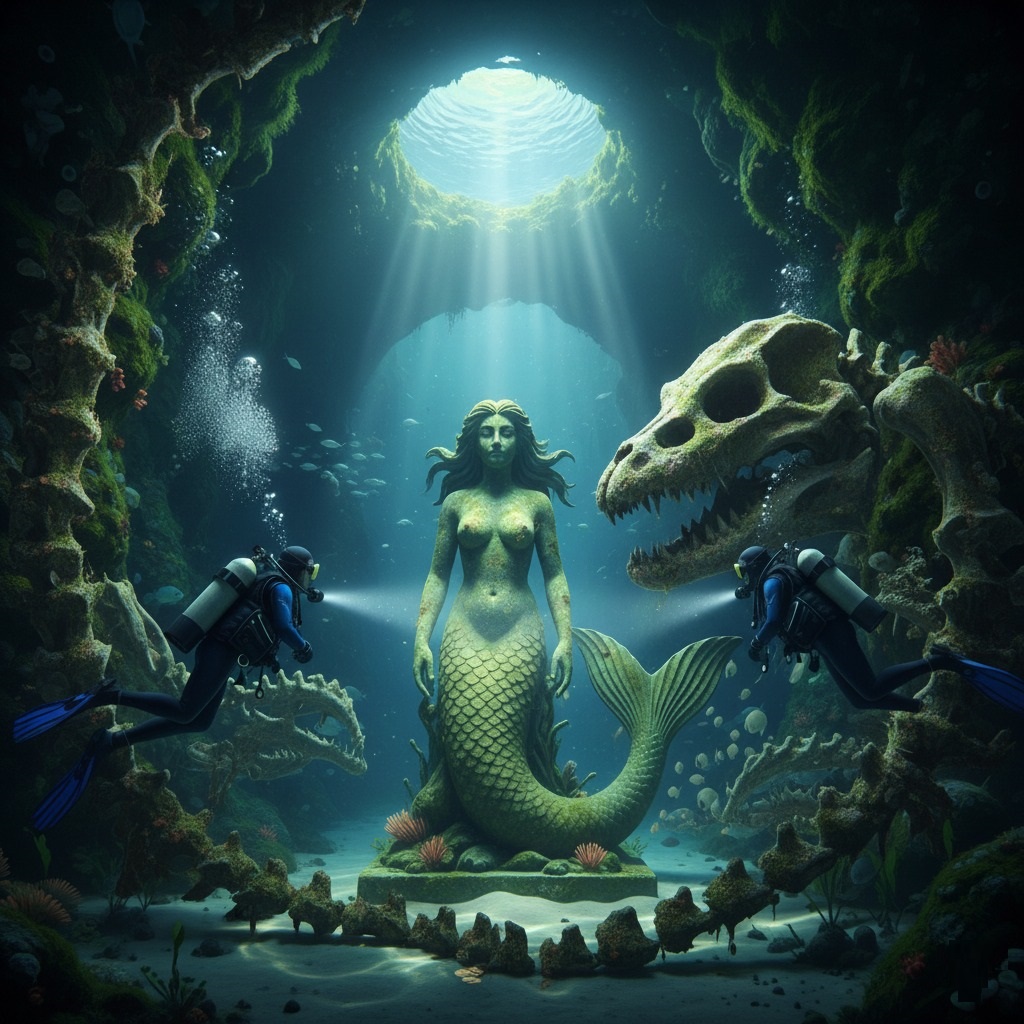 They emerged into a vast, cathedral-like cave. Above, a circular opening, possibly a collapsed section of the trench ceiling, allowed a single, ethereal beam of celestial light to pierce the water, illuminating the cave’s heart. And there it stood: a weathered, moss-covered statue of a mermaid, its upper body a graceful torso, its lower half a majestic, flowing fishtail. Its ancient eyes seemed to gaze into the distant past, radiating an almost melancholic wisdom.