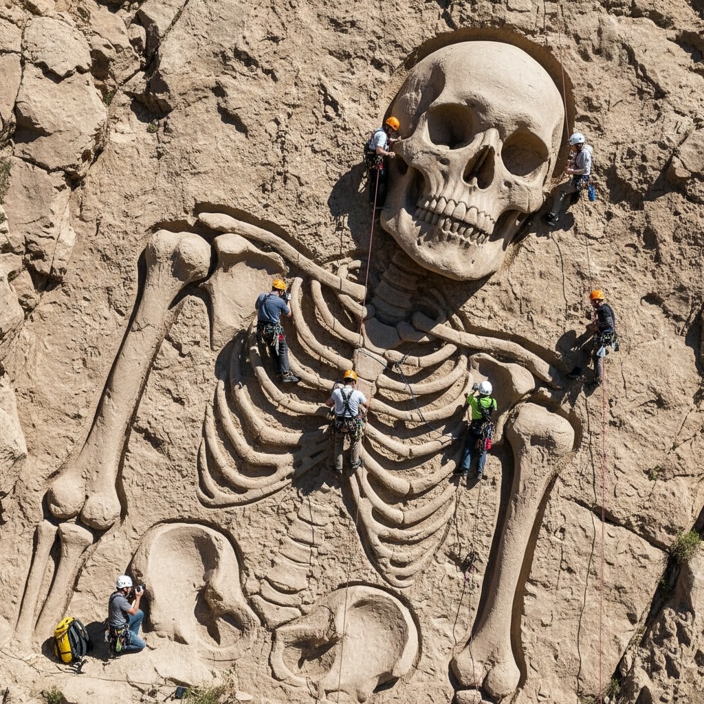 It began with an anomaly. A satellite scan, intended to map new fossil beds, picked up an unusually large, regular structure beneath a relatively unexplored sandstone formation. Initial ground reconnaissance, led by Dr. Thorne and his seasoned team, revealed hints of something impossibly massive. Then, after months of careful excavation and rock removal, the impossible became undeniable: a colossal human skeleton, embedded directly into the ancient rock face.