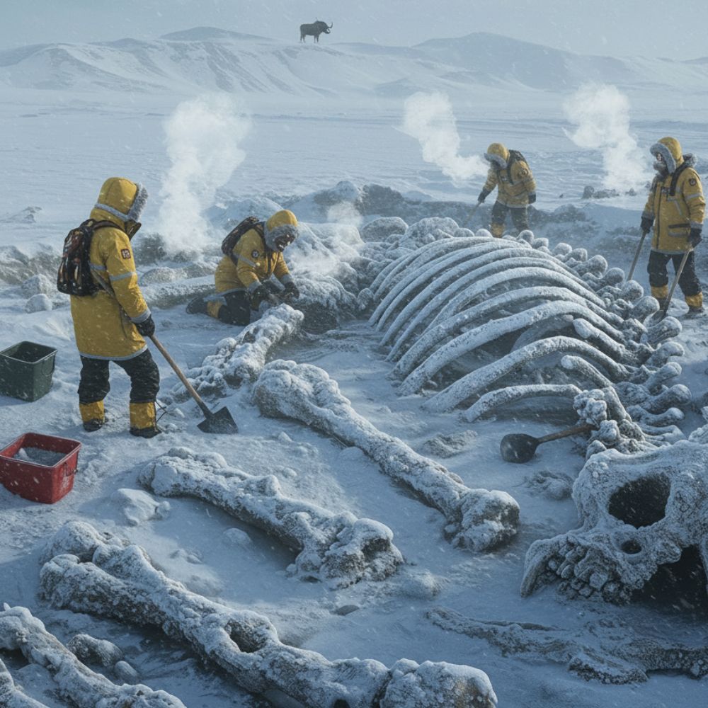 Aris paused, gazing at the sweeping expanse of bone. In the far distance, silhouetted against the pale sky, a lone musk ox grazed on the sparse tundra, a living relic of the Arctic’s hardiness. But this creature… this was something else. Its bones spoke of an age when the northern reaches of the world might have harbored giants unknown to science.