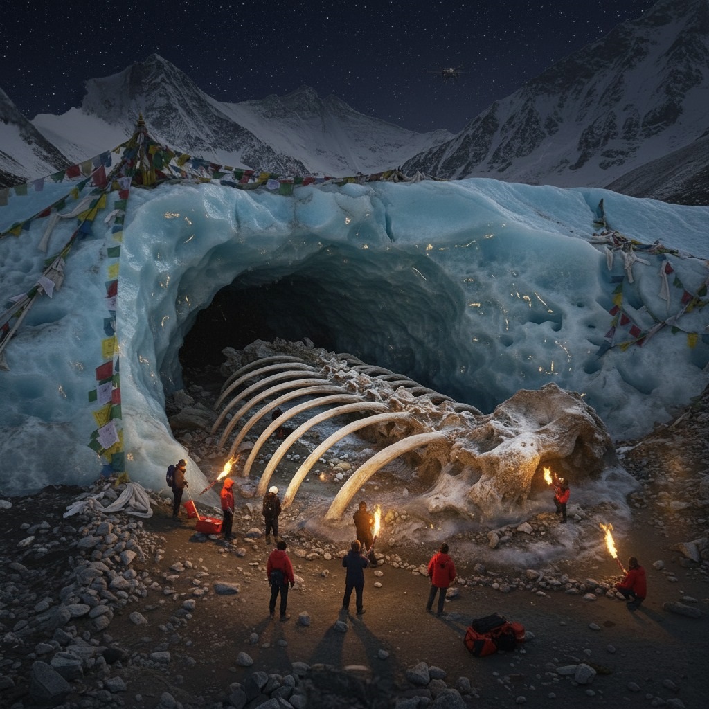 As the sun dipped below the treacherous peaks of Nuptse and Lhotse, plunging the glacier into an inky blackness punctuated only by the distant gleam of Everest, Dr. Thorne’s team ignited their torches. Their flickering flames danced across the shimmering blue walls of the ice cave, revealing the true scale of the discovery. There, frozen for millennia, was a colossal skeleton, its ribs arcing upwards like the keel of some primeval ship.