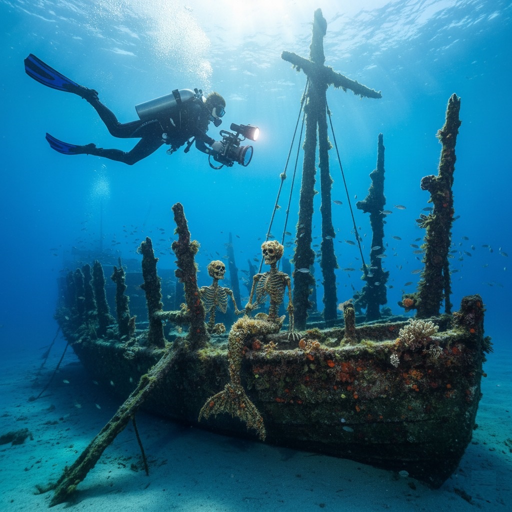 But it was what lay within the main hold that stopped Aris cold, even in the insulated world of his drysuit. Propped against a splintered mast, draped in the seaweed, was a human skeleton, remarkably preserved, seemingly gazing out into the eternal blue. Beside it, however, was something utterly unprecedented: a second skeleton, unmistakable in its form – a mermaid. Its delicate ribcage led to a long, articulated caudal fin, beautifully rendered even in bone.
