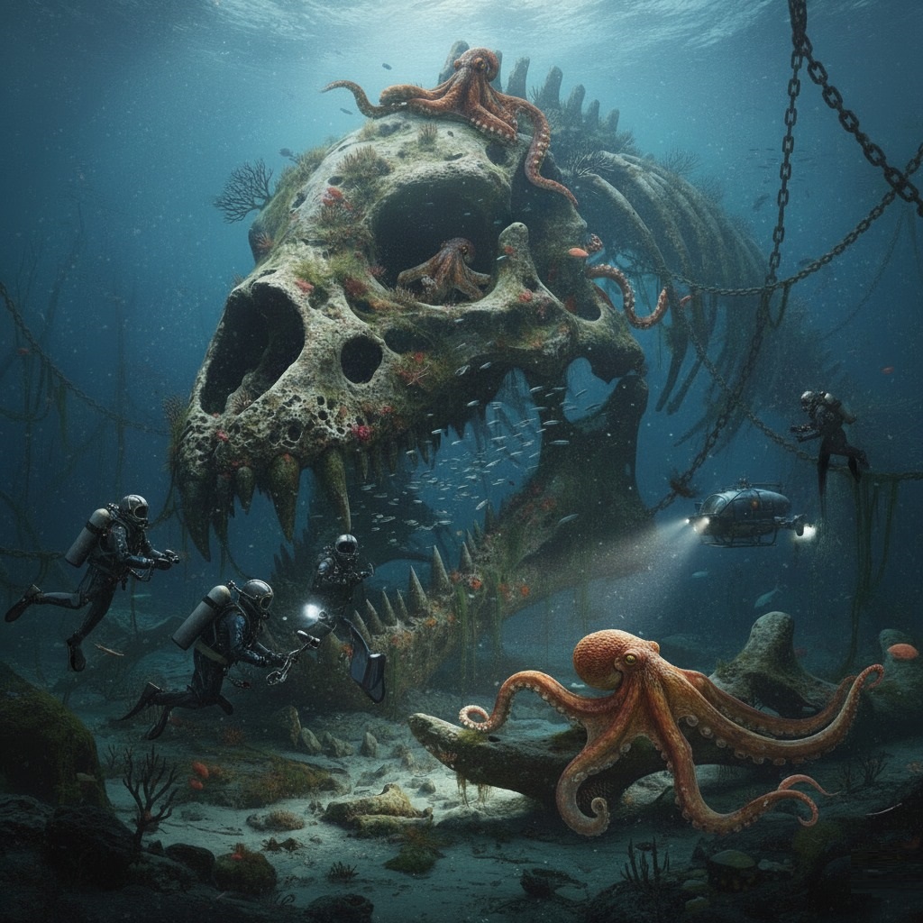 The bones, bleached and barnacled, were a testament to unimaginable eons. Corals in vibrant hues of crimson and gold clung to the vertebrae, while anemones swayed gently in the faint currents. Schools of bioluminescent fish darted through the gaping eye sockets and the cavernous ribcage, turning a tomb into a vibrant, albeit macabre, ecosystem. Thick, ancient chains, likely remnants of some unfathomably old geological event or, more chillingly, an unknown civilization, snaked around parts of the skeleton, anchoring it to the dark seabed.