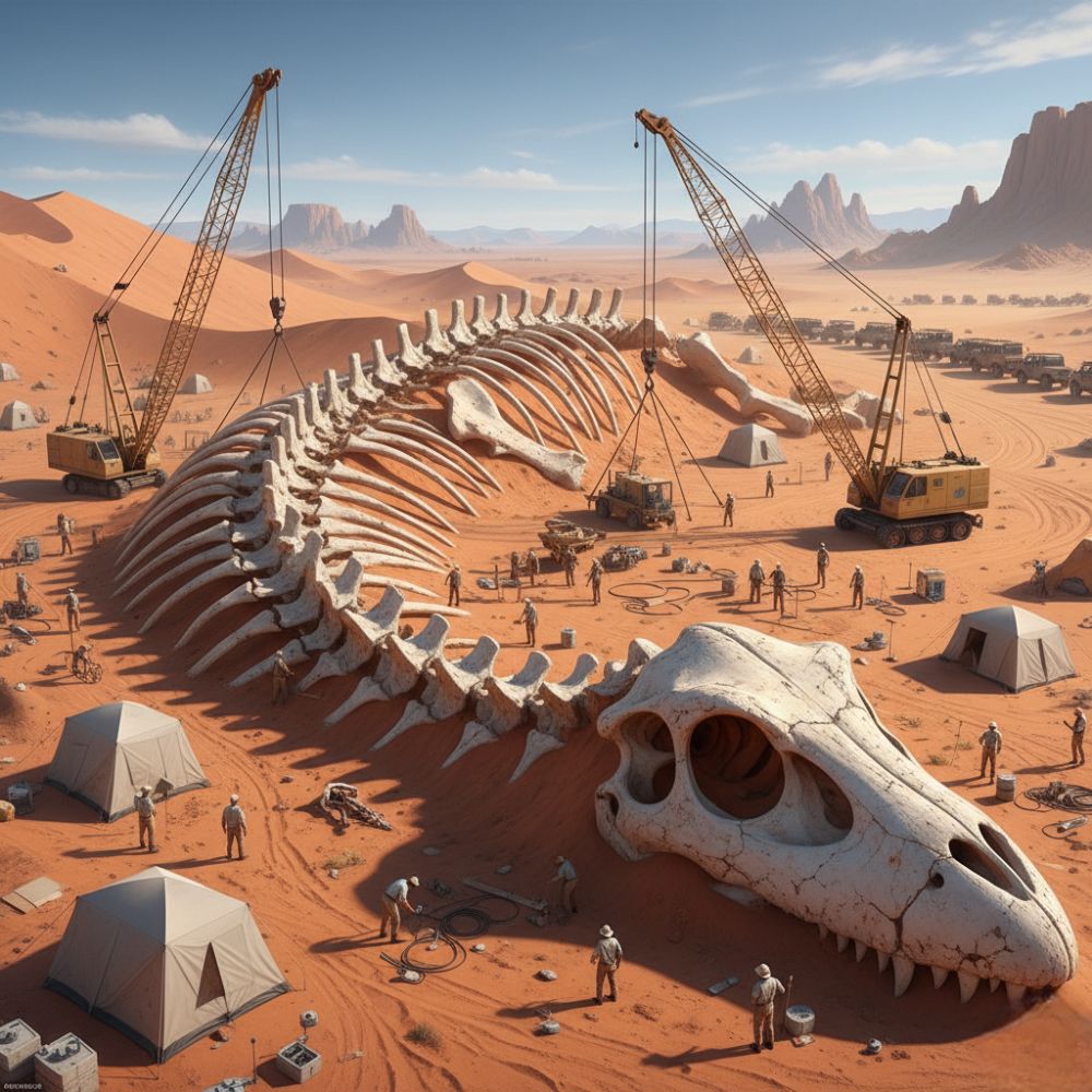 Aris nodded, adjusting his wide-brimmed hat. Two massive cranes, deployed from Cairo, delicately lifted sections of rock and sand, revealing more of the ancient leviathan. Tents, once neat and orderly, now dotted the landscape like a makeshift town, housing palaeontologists, geologists, and conservationists from across the globe. Each sunrise brought a renewed sense of urgency, a desperate race against time, the elements, and the sheer scale of their discovery.