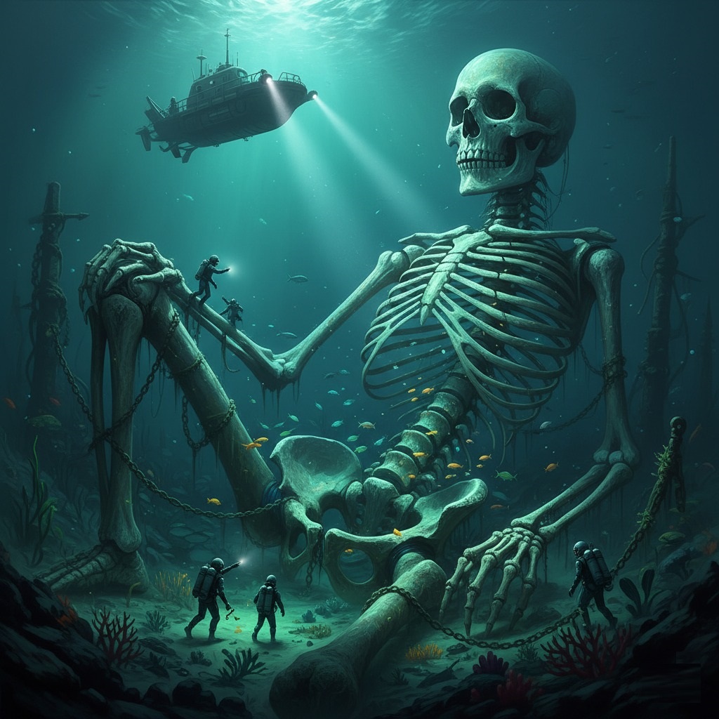 What followed was a meticulous, dangerous, and awe-inspiring excavation. Using remotely operated vehicles (ROVs) equipped with advanced sonic excavators and specialized manipulators, they carefully unearthed the full extent of the discovery. It was indeed a complete human skeleton, though “human” felt inadequate. This being must have stood nearly 200 meters tall. Its bones, miraculously preserved in the anoxic, frigid waters, were denser than any known terrestrial bone structure. Ancient chains, made of an unknown, corrosion-resistant alloy, were found wrapped around its femurs and ribcage, anchoring it to primordial rock formations.