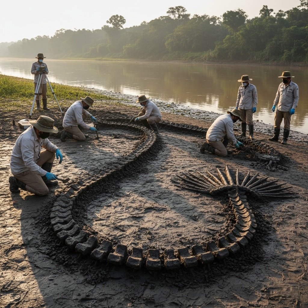As the sun began to climb, painting the sky in fiery oranges and soft purples, the scale of the discovery became terrifyingly clear. It wasn’t just a few bones; it was a colossal vertebral column, each vertebra the size of a dinner plate, extending for what seemed an impossible length along the muddy bank. The team, accustomed to the delicate finds of smaller ancient creatures, stared in stunned silence.