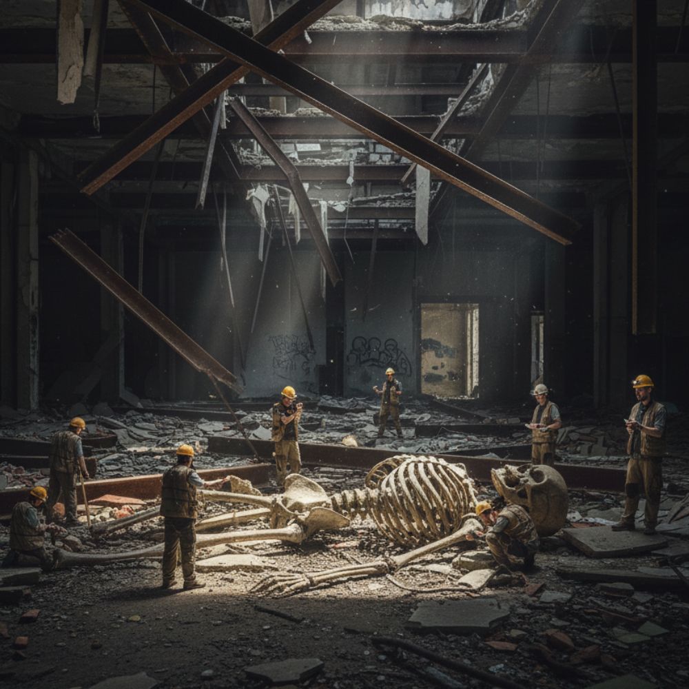 Aris descended into the makeshift trench. What he saw defied belief. Emerging from the compacted earth and rubble was not the expected steel girder or forgotten machinery, but bone. Massive, ancient bone, the colour of aged ivory, yet impossibly large. A femur, easily twice the height of a man, lay half-exposed, its surface smooth and petrified.
