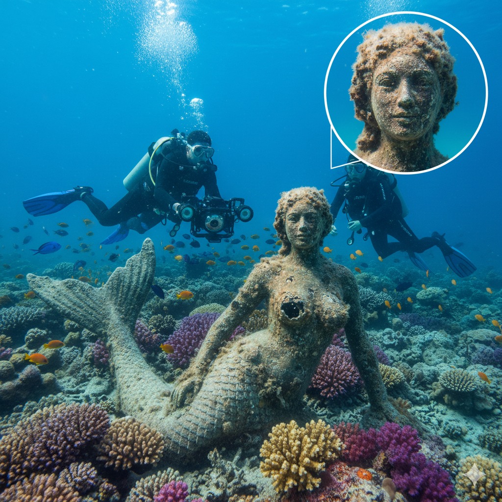 It was a mermaid. A life-sized, weathered statue, its form beautifully sculpted yet profoundly aged. A thin layer of sediment and marine growth clung to its surface, giving its scales a subtle shimmer and its features an ancient, distressed appearance. Bits of coral had begun to colonize its stone skin, blurring the lines between art and nature. Lena, hovering silently behind Aris, her eyes wide with disbelief, slowly drifted closer.
