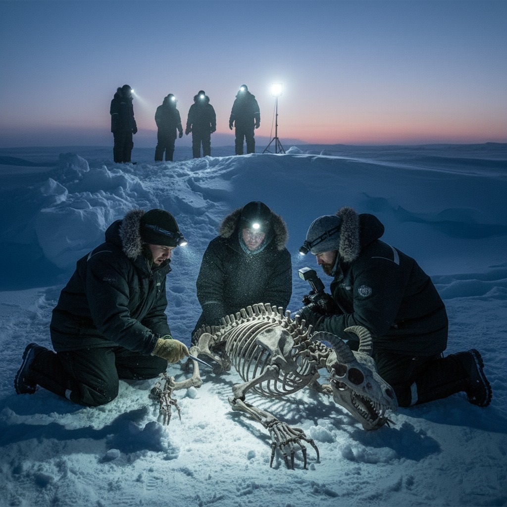 Tonight, the discovery was finally being properly assessed. Alistair, his breath clouding in the frigid air, knelt beside the colossal rib cage, his gloved fingers tracing the calcified contours. The ice around it hummed with an otherworldly silence, broken only by the scrape of shovels and the occasional crackle of their radio. Elias was meticulously chipping away at a section of the skull, his brow furrowed in concentration, while a Danish photographer, Lars, captured every detail with his heavy camera, its flash illuminating dust motes of ancient ice. In the background, their Greenlandic guide, a stoic hunter named Kala, watched, his eyes holding a mixture of curiosity and a deep, ancestral respect for what lay buried.