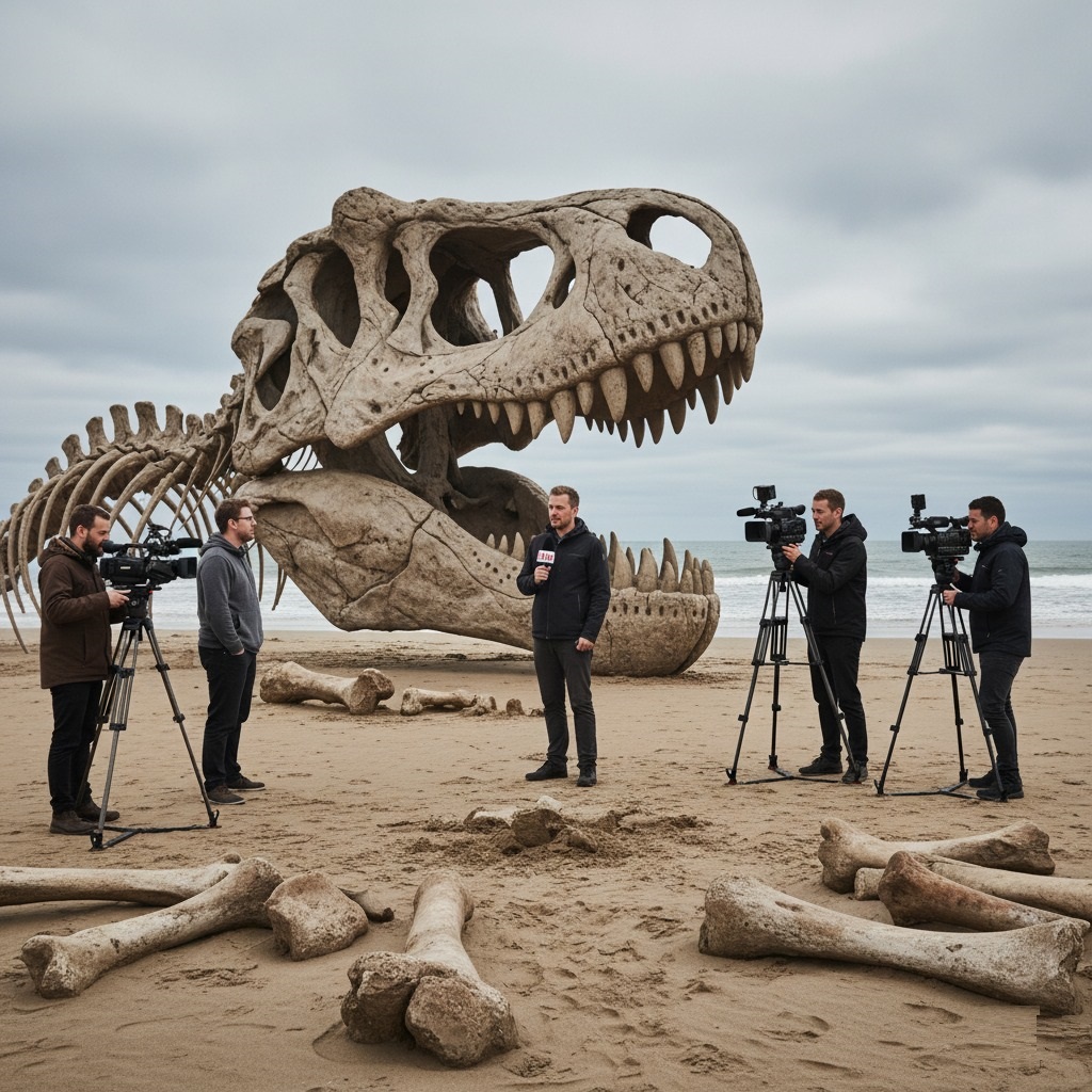 Within weeks, Charmouth Beach transformed. The quiet fossil hunting haven became a global spectacle. Five male journalists and videographers, representing international news outlets, descended upon the site. Their cameras, perched on tripods, meticulously captured every angle of the magnificent skull, its bone-like texture and terrifying teeth illuminated by the grey, persistent light of the English winter sky. A lead reporter, microphone in hand, narrated the unfolding drama, his voice carrying the weight of geological time. Around the central display, various other bone fragments—a massive femur here, several vertebrae there—lay scattered, illustrating the sheer scale of the creature and the painstaking effort of the paleontological team.