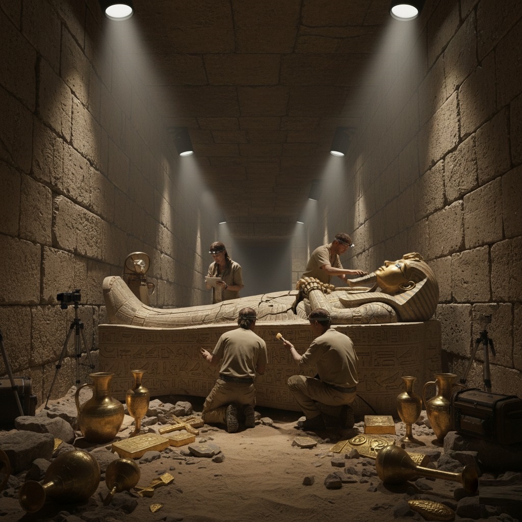 The scene was precisely as the image depicts: a chaotic, yet awe-inspiring testament to forgotten royalty. Golden vessels, some intricately detailed, others plain and utilitarian, lay scattered on the sandy floor, alongside ingots and shimmering amulets. The archaeologists moved with a practiced reverence, their headlamps illuminating their focused faces. Dr. Thorne knelt by the sarcophagus, his gloved fingers hovering over the ancient stone, while Lena began meticulously cataloging the artifacts. Two other team members were setting up photographic equipment, already capturing the pristine state of the discovery.
