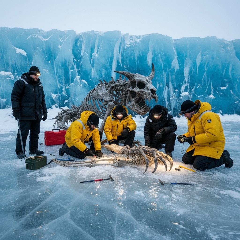 What finally appeared from its frozen tomb was a monstrous skeleton, weathered by untold millennia, its skull horned and menacing, its clawed forelimbs disproportionately large. It lay as if arrested in motion, forever preserved in the geological heartbeat of the ice. The sheer scale and terrifying majesty of the creature sent a shiver down Finch’s spine, far colder than the arctic air.