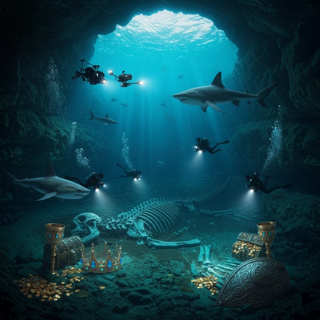 — not a dinosaur, nor any known marine creature, but something disturbingly humanoid in its basic structure, yet titanic in scale. Its skull alone was the size of a small car, its ribcage a cavern unto itself. Two majestic reef sharks, ancient guardians of the cenote, drifted lazily above, seemingly indifferent to the intruders.