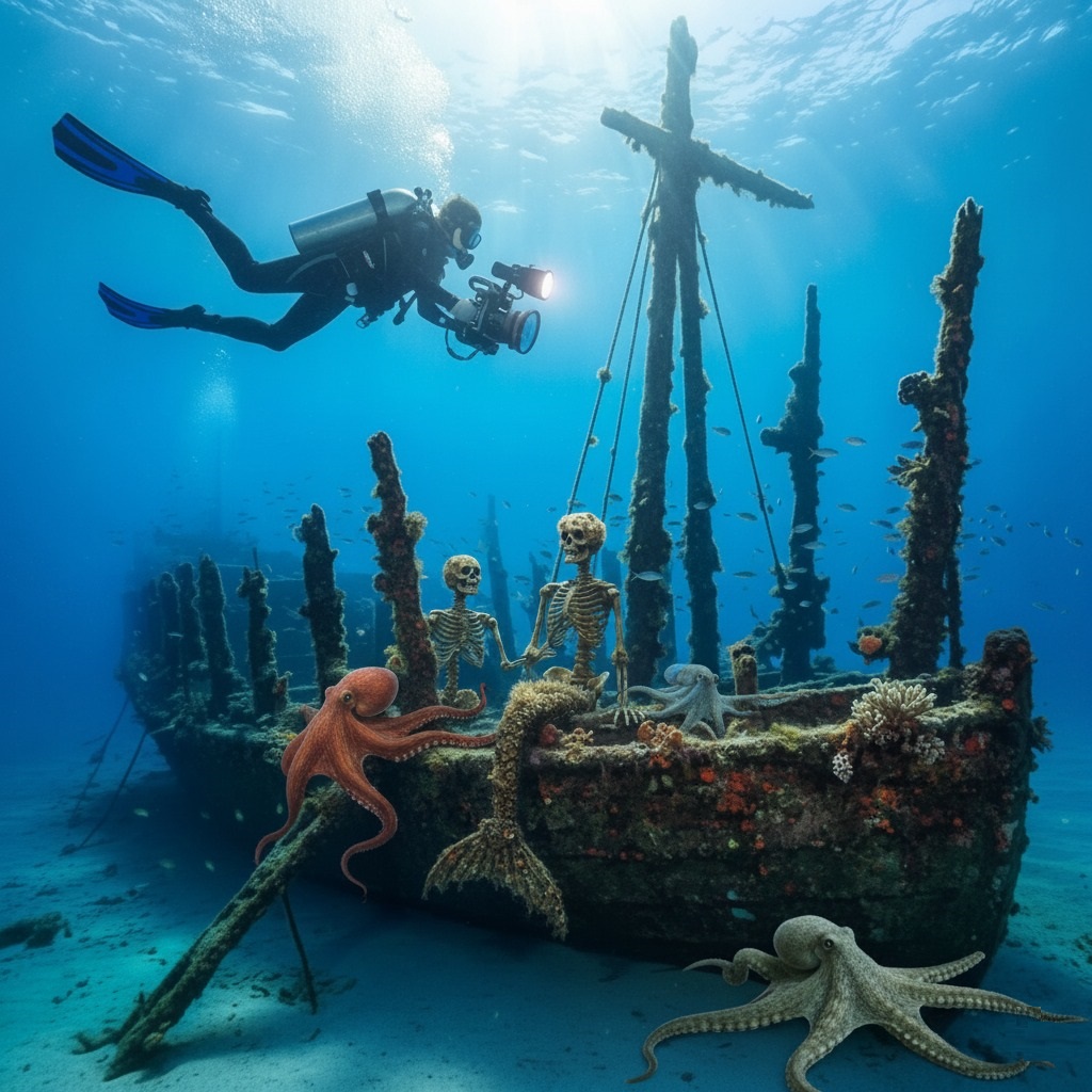 “Log entry: Truk Lagoon, Wreck Site designation ‘Siren’s Rest’,” Aris narrated into his comms. “Preliminary assessment indicates a vessel possibly late 19th or early 20th century, possibly a schooner or a small cargo ship. Unprecedented discovery of three articulated human skeletons on deck, one with what appears to be a fabricated mermaid prosthesis. Local marine life, specifically Octopus vulgaris specimens, exhibiting unusual territorial behavior around the remains.”