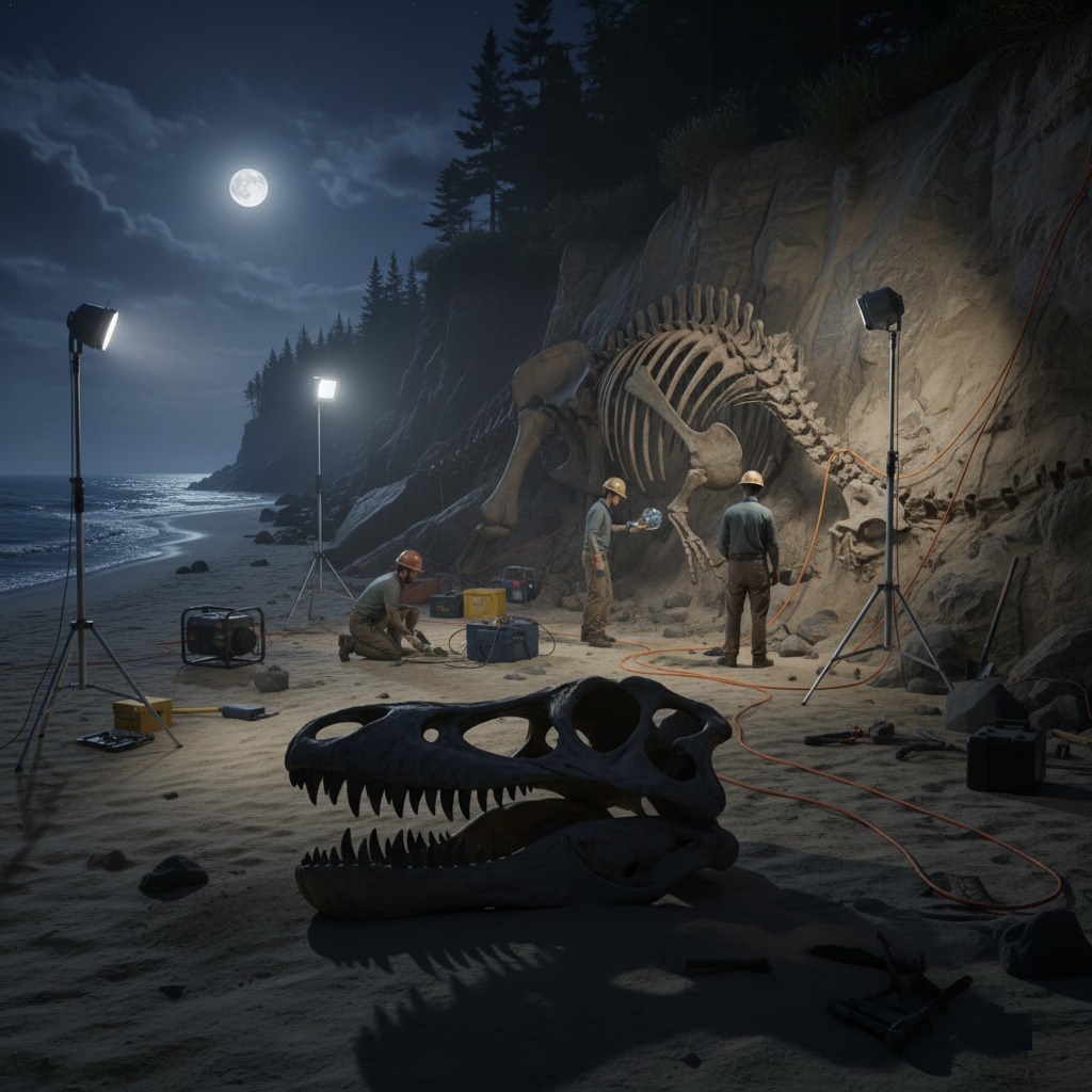 The air was thick with the scent of sea salt and damp earth, punctuated by the metallic tang of their tools. Cables snaked across the sand, connecting portable generators to their delicate instruments and the array of powerful lights that transformed the beach into an alien landscape of stark contrasts. Every brushstroke, every careful chisel strike, was a communion with the deep past, a whisper across 66 million years.