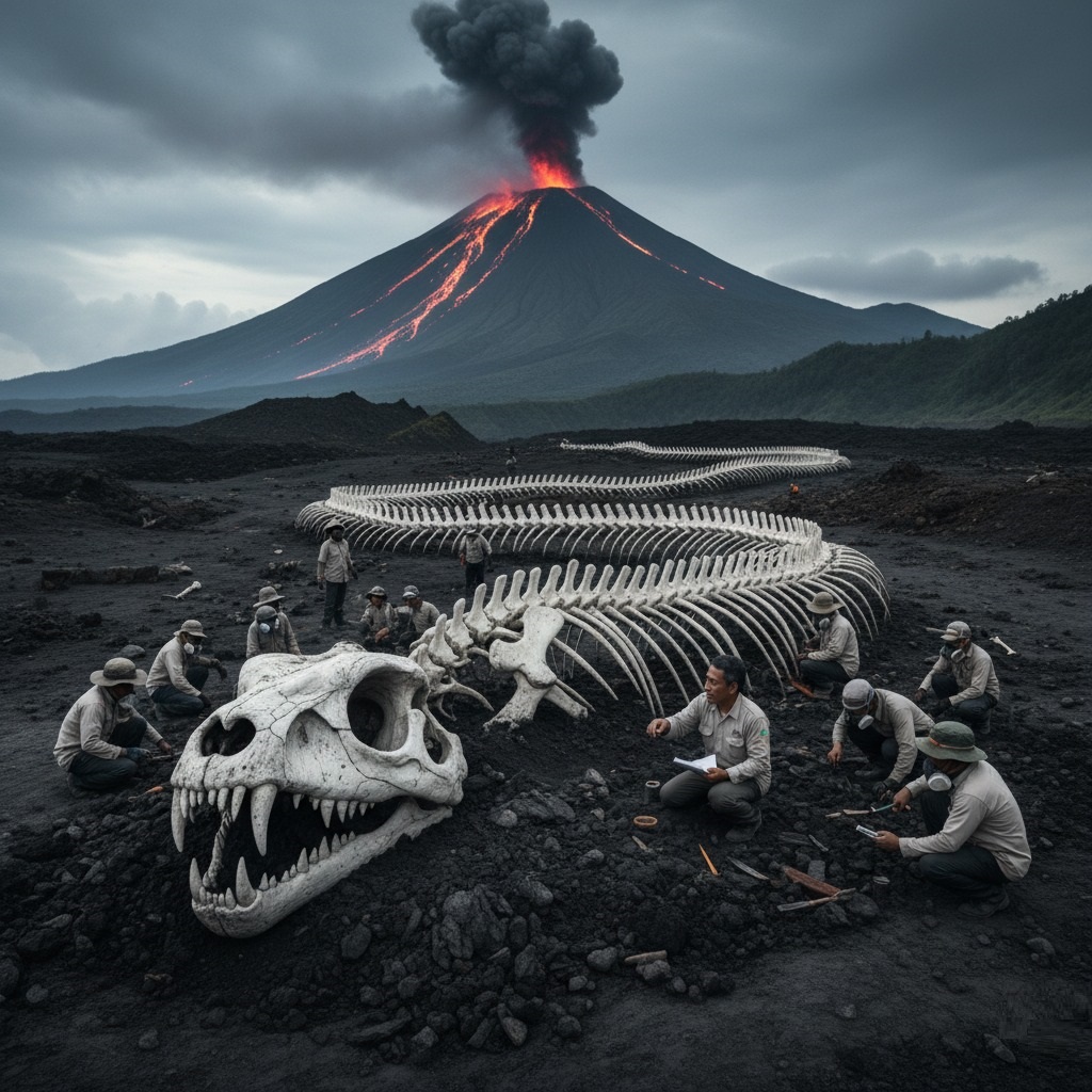 Aris often found himself pausing, staring at the articulated skeleton, its bone-white curves stark against the black earth, with Merapi’s fiery crest burning in the distance. What cataclysm had entombed this leviathan? What secrets of primordial Java did it hold? The questions were as vast and profound as the serpent itself.