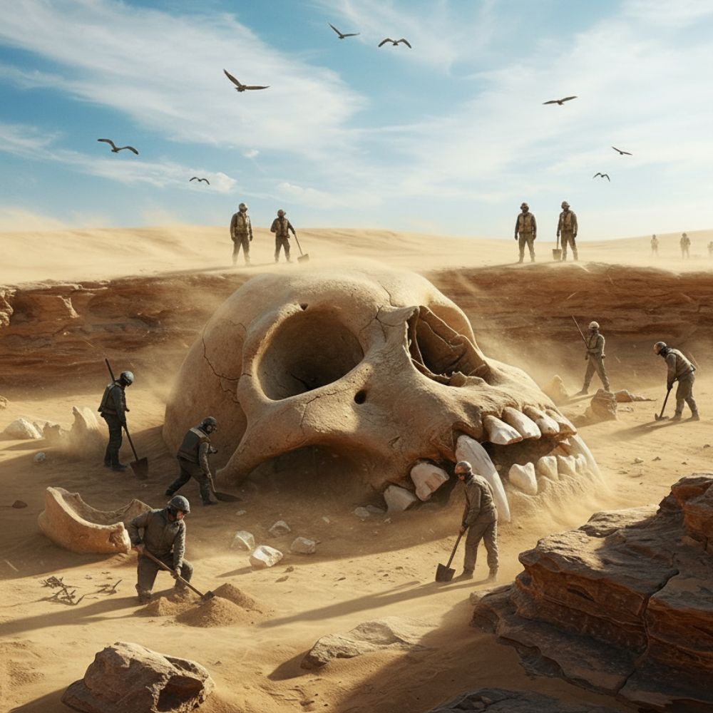 Aris scrambled down a small embankment, kicking up plumes of fine ochre dust. What he saw brought him to an immediate, stunned halt. Emerging from the sand, gargantuan and impossibly ancient, was the unmistakable curve of a cranium. Not human, not even dinosaur, but something far more unsettling in its familiarity: a primate skull, but on a scale that defied all known evolutionary records.